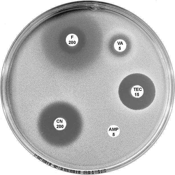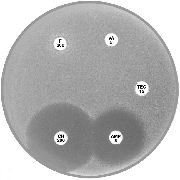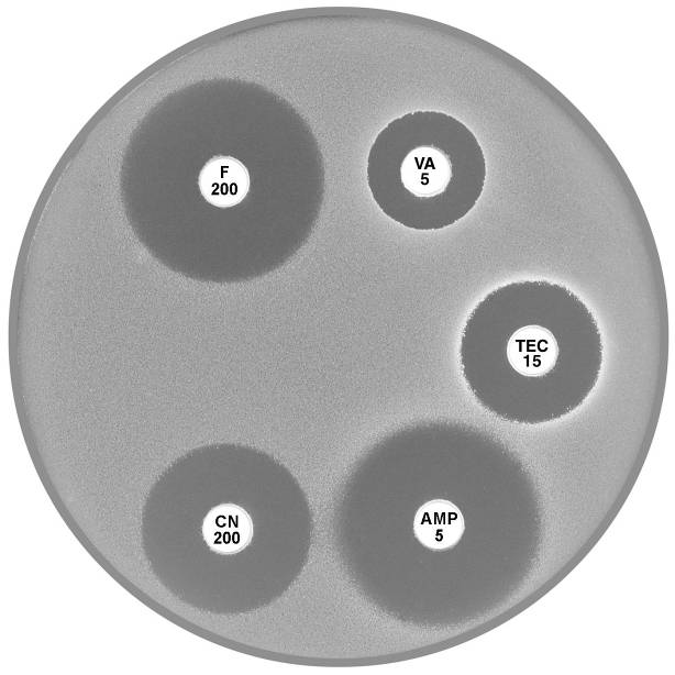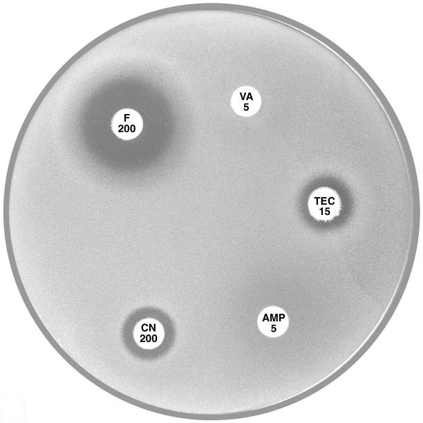 Plate 12.2.B Enterococcus faecium with VanA type vancomycin resistance Resistance to both vancomycin (VA 5) and teicoplanin (TEC 15) is typical of the vanA phenotype. |