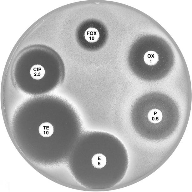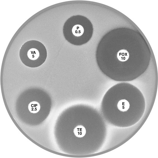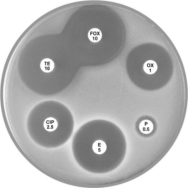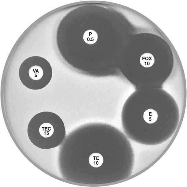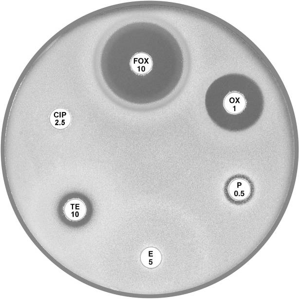 Plate 12.3.C Staphylococcus aureus resistant to penicillin only Note the 9 mm annular radius of the zone of inhibition around cefoxitin (FOX 10). |