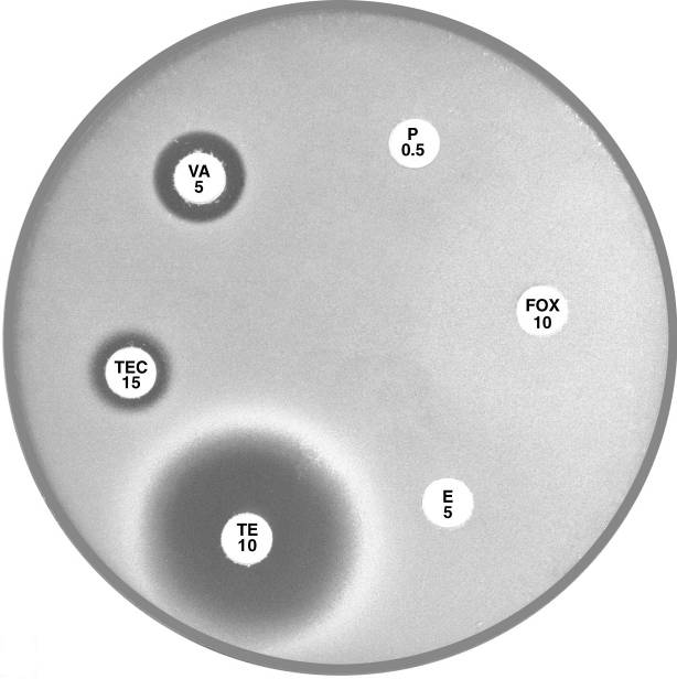 Plate 12.3.A Staphylococcus aureus ATCC 9144 (NCTC 6571) This organism is fully susceptible and has large inhibitory zones around penicillin (P 0.5), cefoxitin (FOX 10), vancomycin (VA 5) and teicoplanin (TEC 15); 12 mm, 10 mm, 3 mm and 5 mm respectively. |
