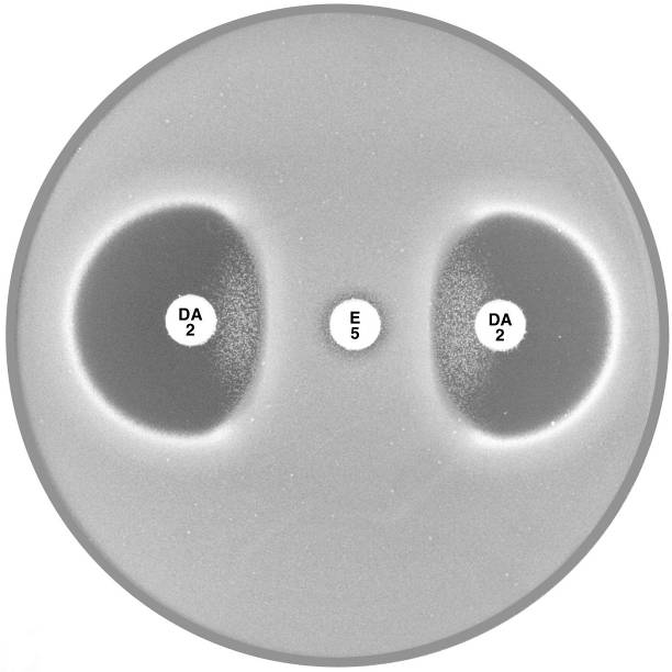 Plate 12.4.D MRSA with inducible clindamycin resistance (ICR) Inducible clindamycin resistance (ICR) is indicated by the absence of an inhibitory zone around erythromycin (E 5) and a flattening of the clindamycin (DA 2) zone adjacent to the erythromycin disc. |