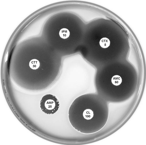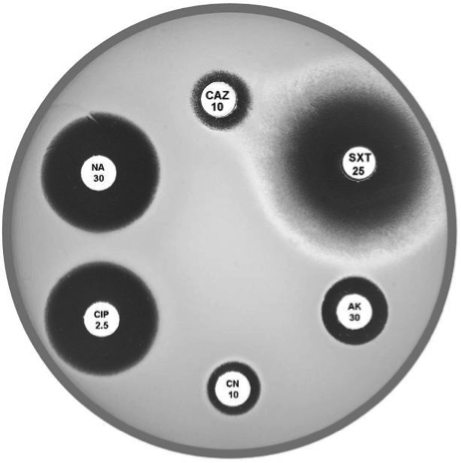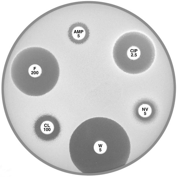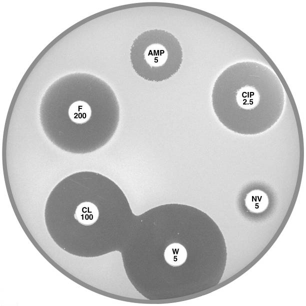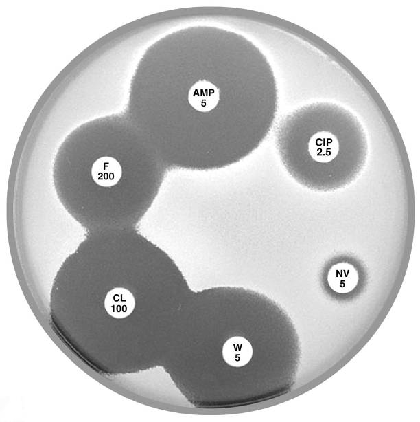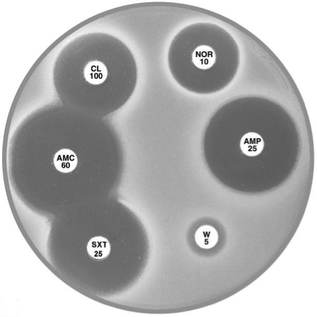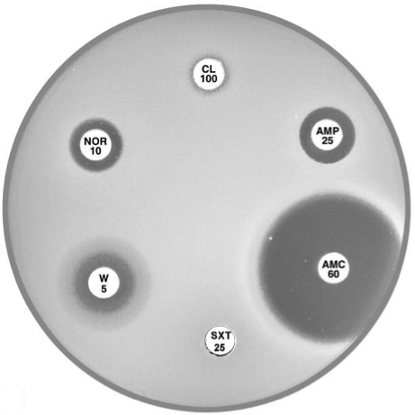 Plate 12.6.A Acinetobacter lwoffi A large inhibitory zone around ampicillin (AMP 25), a smaller one around cephalexin (CL 100), resistance to trimethoprim (W 5) and a lack of synergy with sulphonamide (SXT 25) are typical of A. lwoffi |