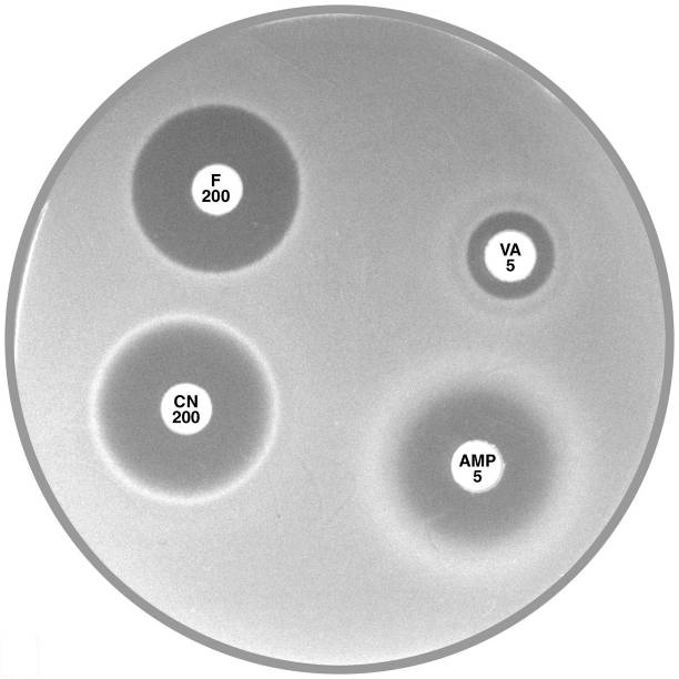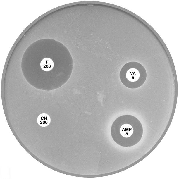Plate 12.1.C Enterococcus faecium and nitrofurantoin The hazy edged zone of inhibition around nitrofurantoin and no zone of inhibition around ampicillin is characteristic of E. faecium. |