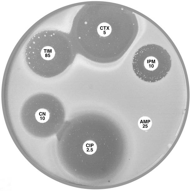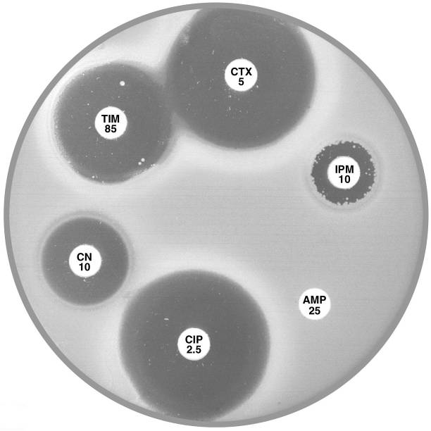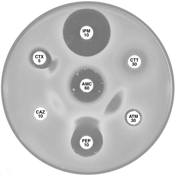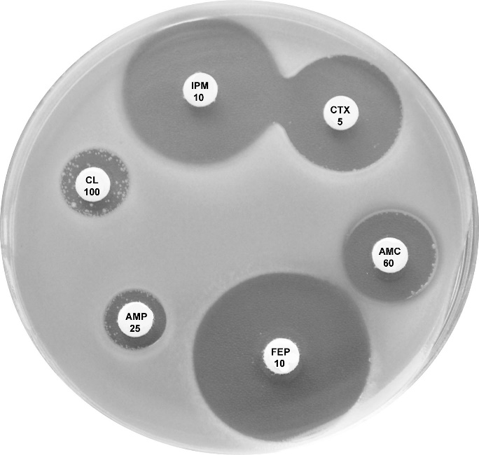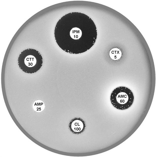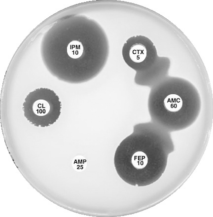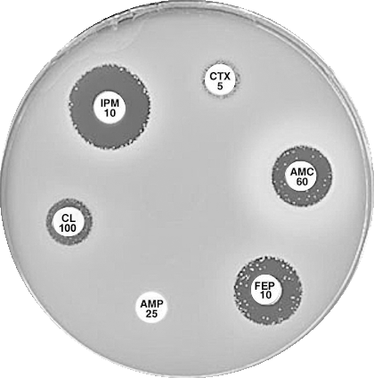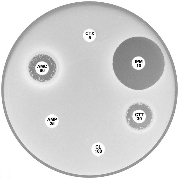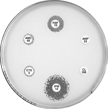 Plate 12.15.A K. pneumoniae producing an MBL on routine CDS test. Resistant to AMP 25, AMC 60, CTX 5, CL100 and FEP 10, colonies at the edge of imipenem (IPM 10) zone 6 mm, see sect. 5.5.8 |