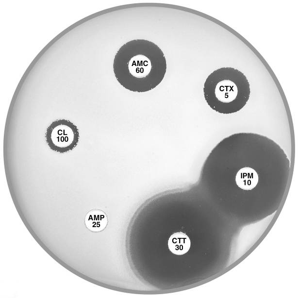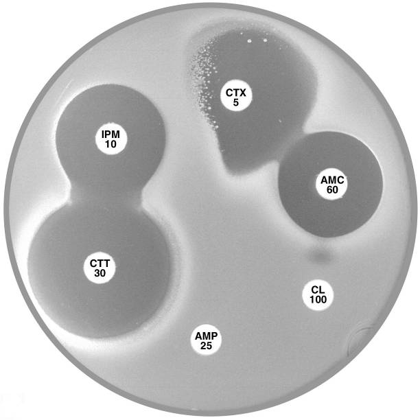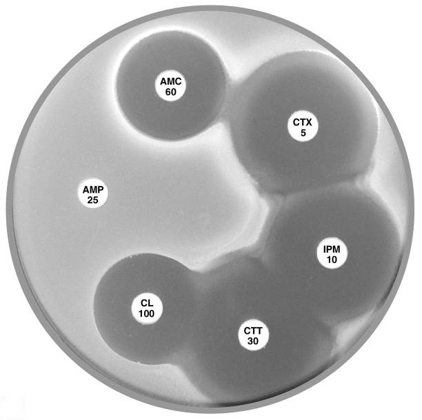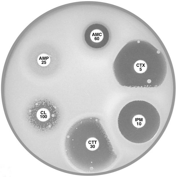 Plate 12.8.A Escherichia coli ATCC 35218 producing TEM-1 β-lactamase This strain is resistant to ampicillin (AMP 25), but susceptible to amoxycillin-clavulanic acid (AMC 60), cefotaxime (CTX 5), imipenem (IPM 10), cefotetan (CTT 30) & cephalexin (CL 100). |