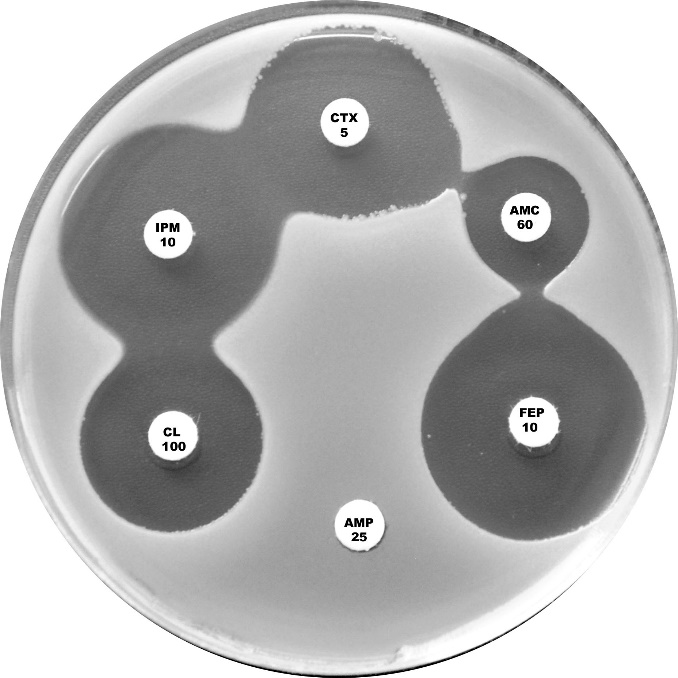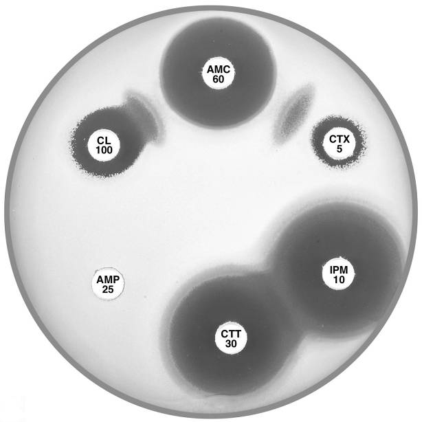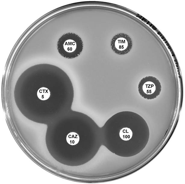 Plate 12.9.D. Escherichia coli plasmid mediated AmpC β-lactamase (higher activity) Synergy observed between a BA 200 g disc and the -lactam discs, CL 100 (no mm), AMC 60 (4mm), CAZ (4mm) and CTX 5 (numerous resistant colonies) |