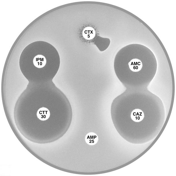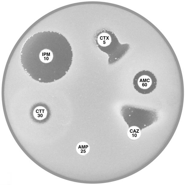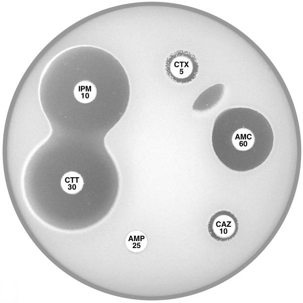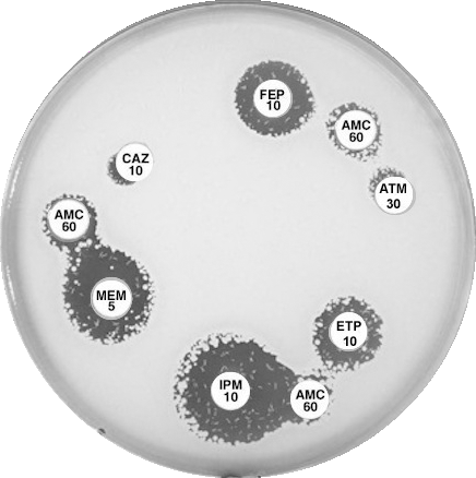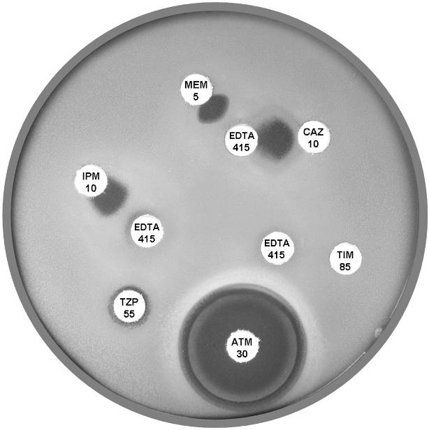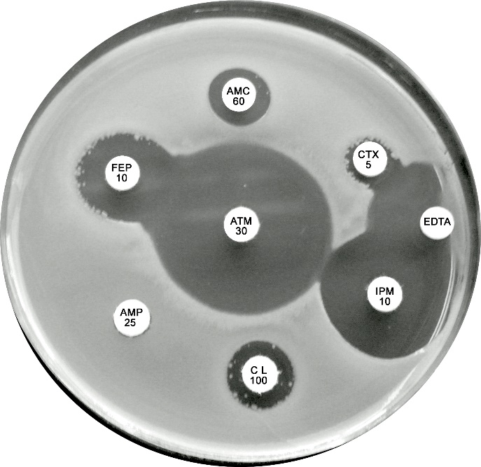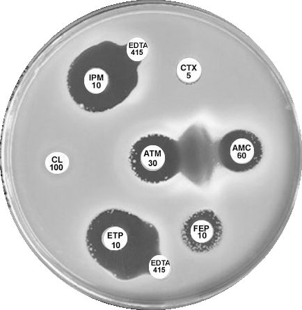 Plate 12.15.B K. pneumoniae producing an MBL and an ESBL MBL because EDTA confirmatory test positive, ESBL because small ATM (aztreonam) with synergy between ATM and AMC (amoxycillin-clavulanic acid). |