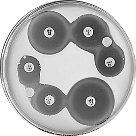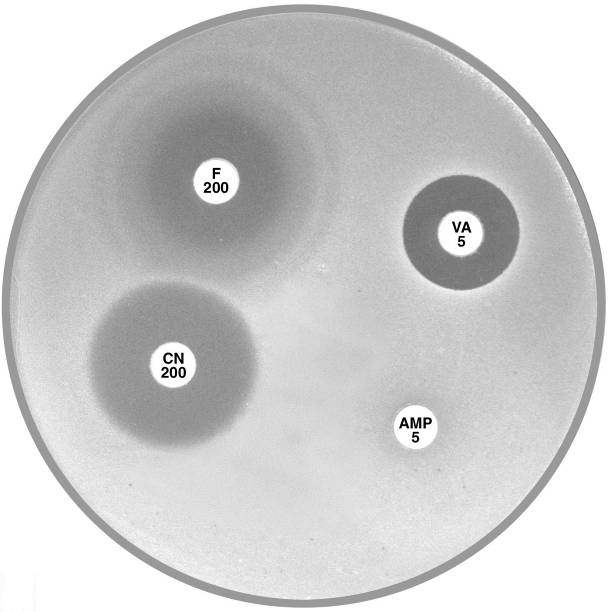 Plate 12.1.B Enterococcus faecalis producing β-lactamase The sharp edge and the reduced inhibitory zone around ampicillin (AMP 5) indicate β-lactamase production and resistance. |