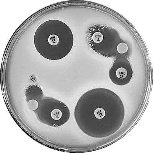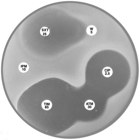 Plate 12.14.B Pseudomonas aeruginosa producing a metallo β-lactamase (carbapenemase) Showing the inhibition of the carbapenemase by EDTA. |