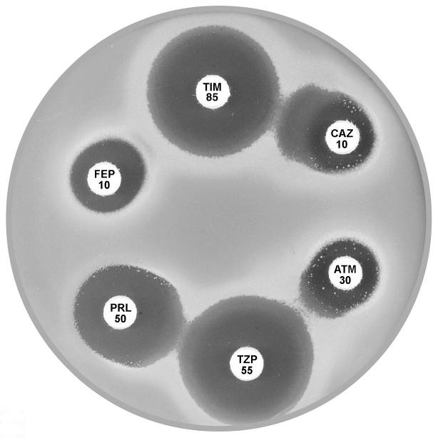 Plate 12.14.A Pseudomonas aeruginosa producing an ESBL Showing synergy between ticarcillin-clavulanic acid (TIM 85) & ceftazidime (CAZ 10) and between piperacillin-tazobactam (TZP 55) & aztreonam (ATM 30). |