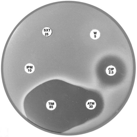Plate 12.17.A Stenotrophomonas maltophilia Note the lack of an inhibitory zone around imipenem, the pear shaped zone of inhibition between trimethoprim-sulfamethoxazole and trimethoprim and the resistant colonies within the ticarcillin-clavulanic acid and aztreonam inhibitory zones. |